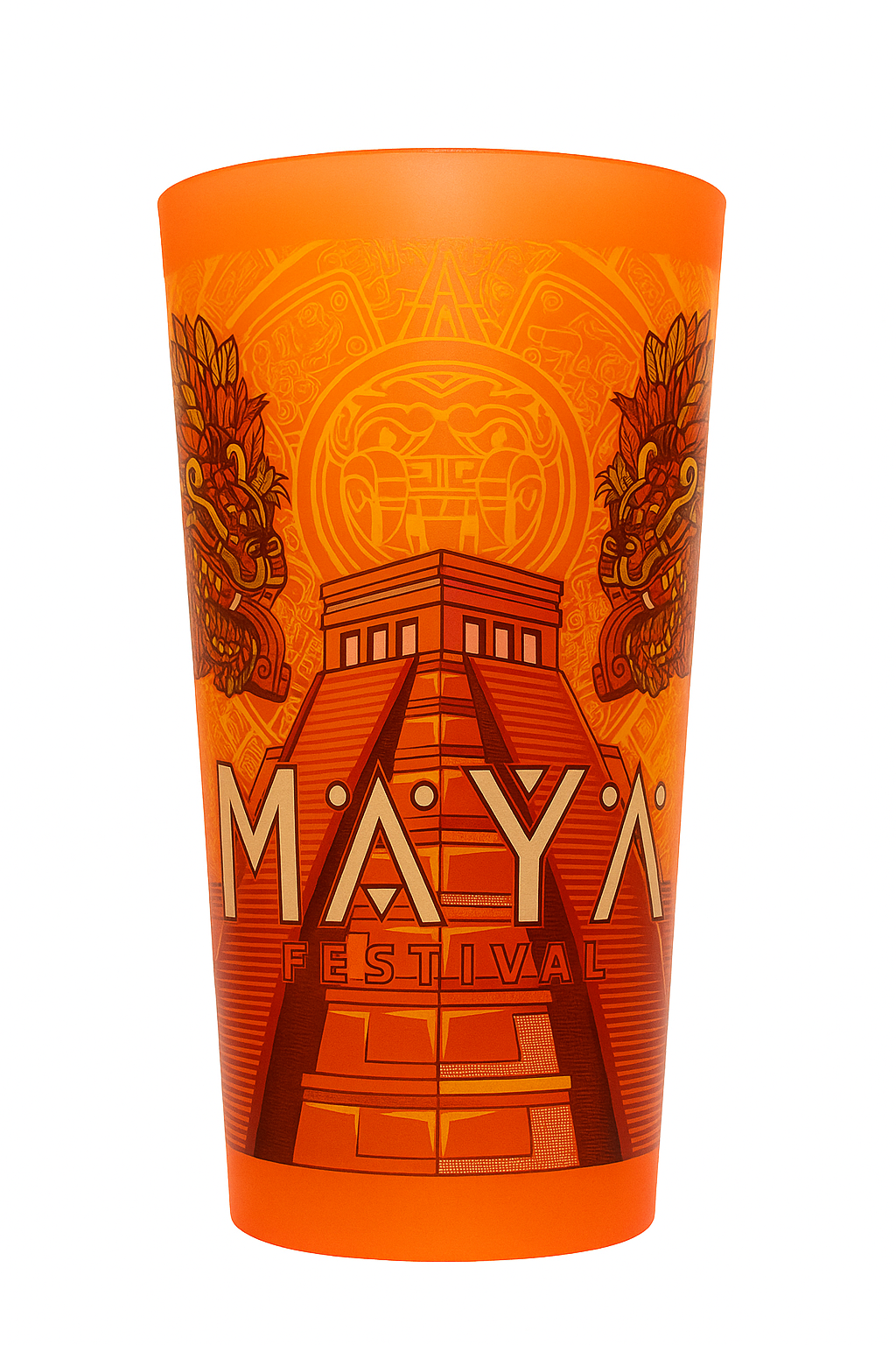 Copo exclusivol Maya, 600ml, em plástico resistente, reutilizável e ecológico. Design com cores vibrantes que destacam o espírito do evento.