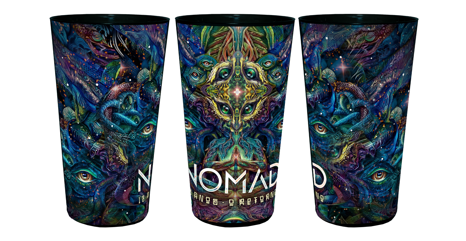 Copo exclusivo Nomad 2026, 600ml, em plástico resistente, reutilizável e ecológico. Design com cores vibrantes que destacam o espírito do evento.
